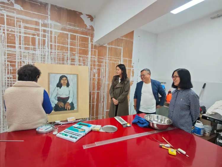 2025年10月21日,凉山州博物院邓海春副院长一行2人莅临昆明市博物馆考察交流,昆明市博物馆科技保护部高静铮主任、副研究馆员马卫军、陈颢等人热情接待了来访的同行。来宾们现场考察了昆明市博物馆科技保护部文物保护修复实验室,书画修复室及展藏环境监测预警平台等文物保护相关工作场所,咨询本馆文物保护工作运行的整体情况。在书画修复室,现场观摩本馆油画文物的修复过程,并就